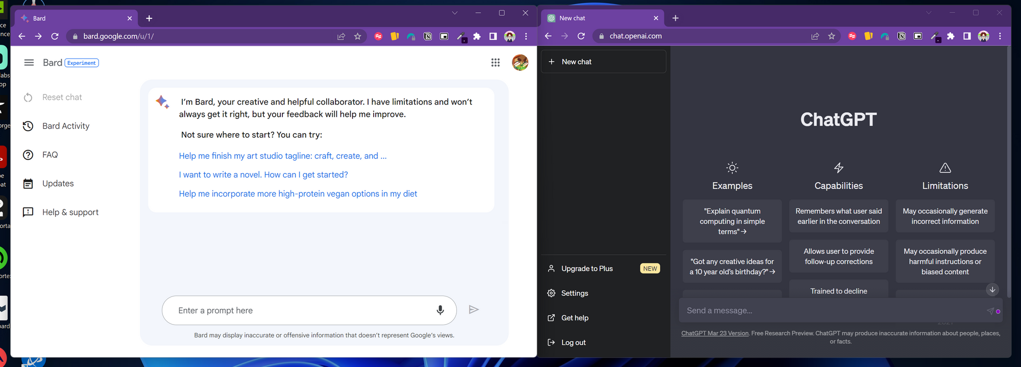 In conclusion, I like Bard more. I think the design is cleaner and I just hope Google lets you put the UI into dark mode in the future.
